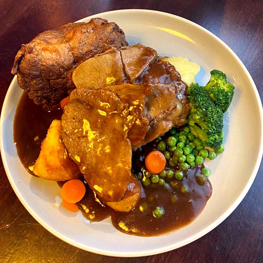 Served with roast and mashed potatoes, Yorkshire pudding, seasonal vegetables and lashings of gravy.