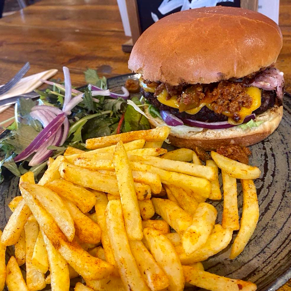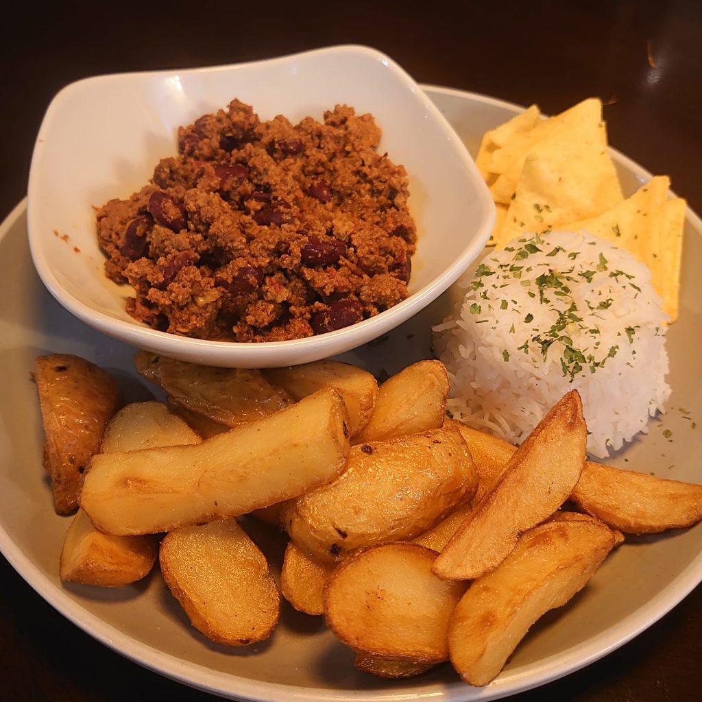 Both our beef and meat-free chillies are homemade, and come with rice, salad and hand cut chips .