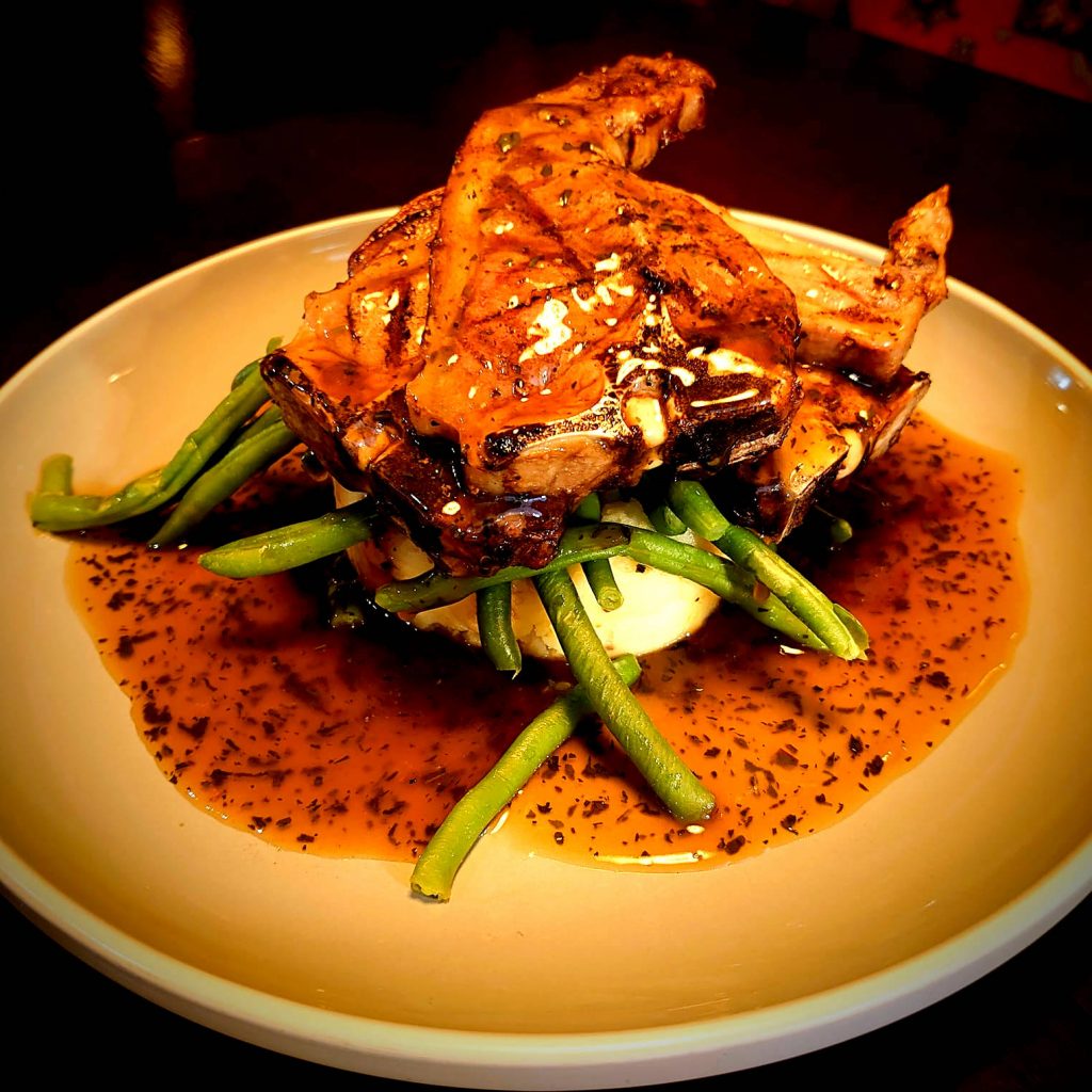 Served with creamy mash, green beans and minty gravy.