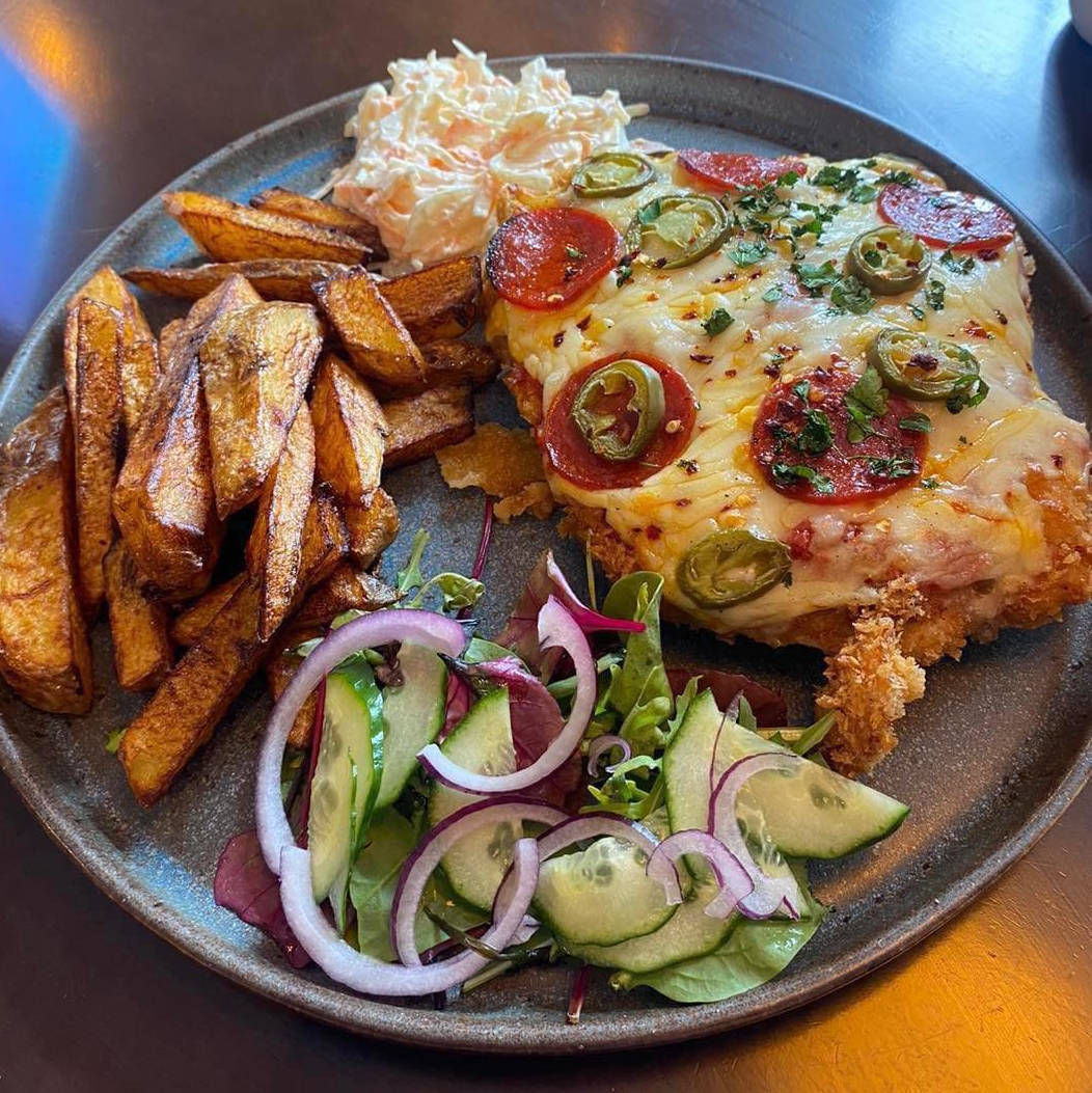 Breaded breast of chicken, topped with bechemel sauce and cheese, served with hand cut chips and onion rings.