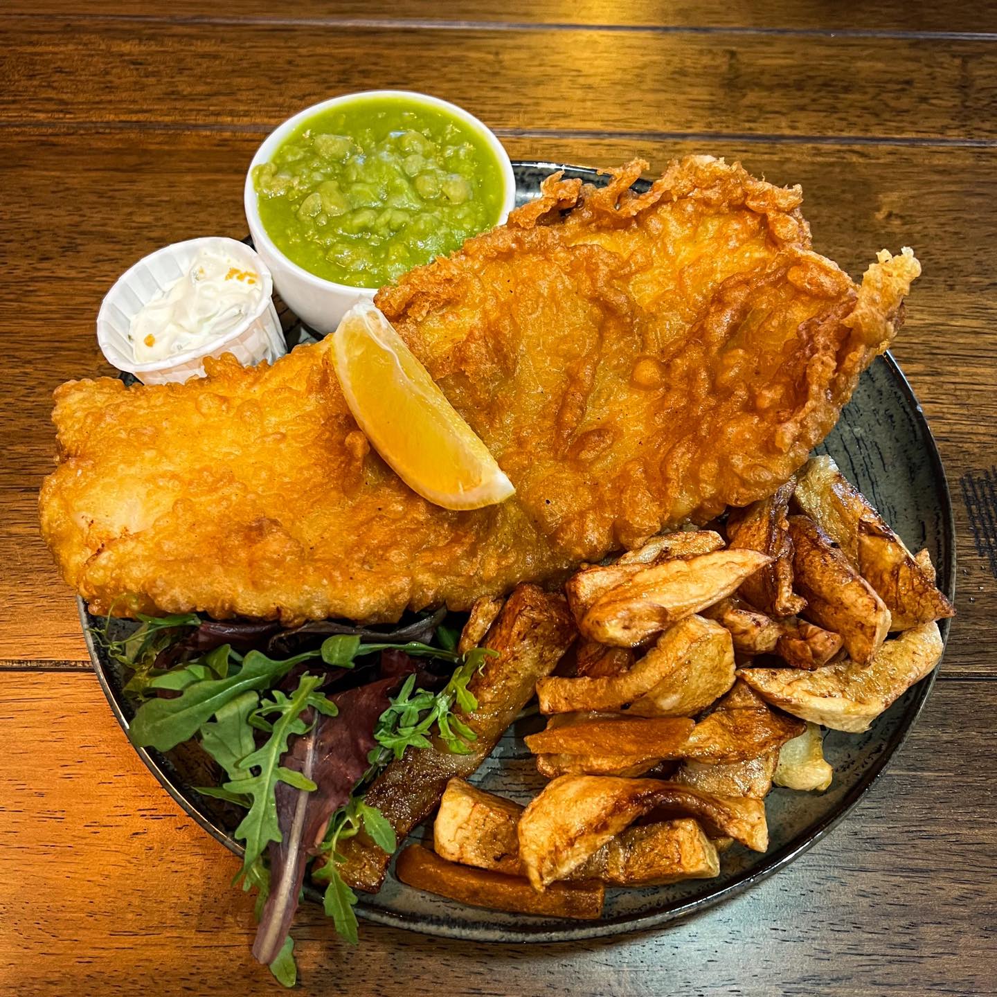 Beer battered cod, hand cut chips, mushy peas and tartare sauce.