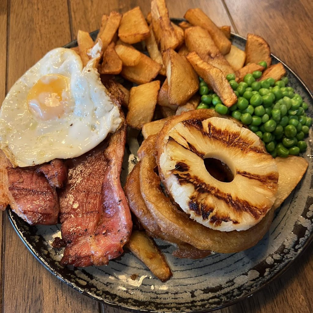 Served with hand cut chips, peas, salad, and a choice of pineapple or fried egg.