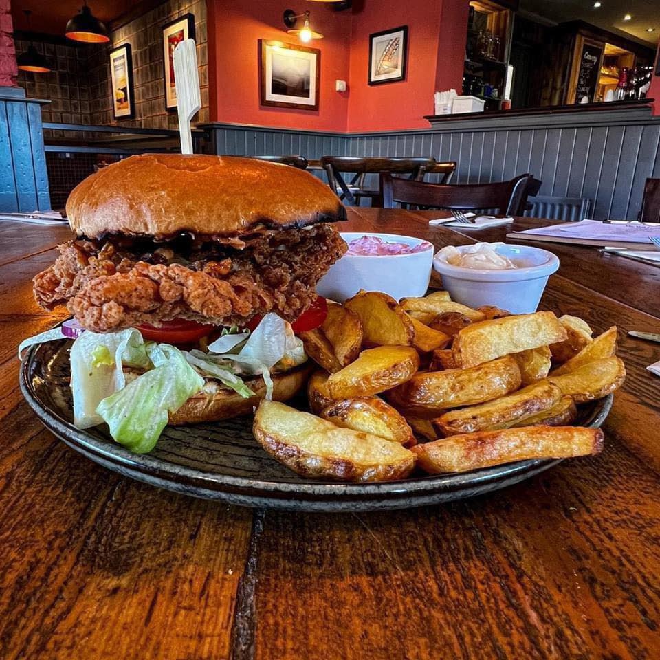 A 6oz 100% Aberdeen Angus beef pattyin a brioche bun with lettuce, tomato, red onion and gherkin. served with coleslaw, side salad and fries.
